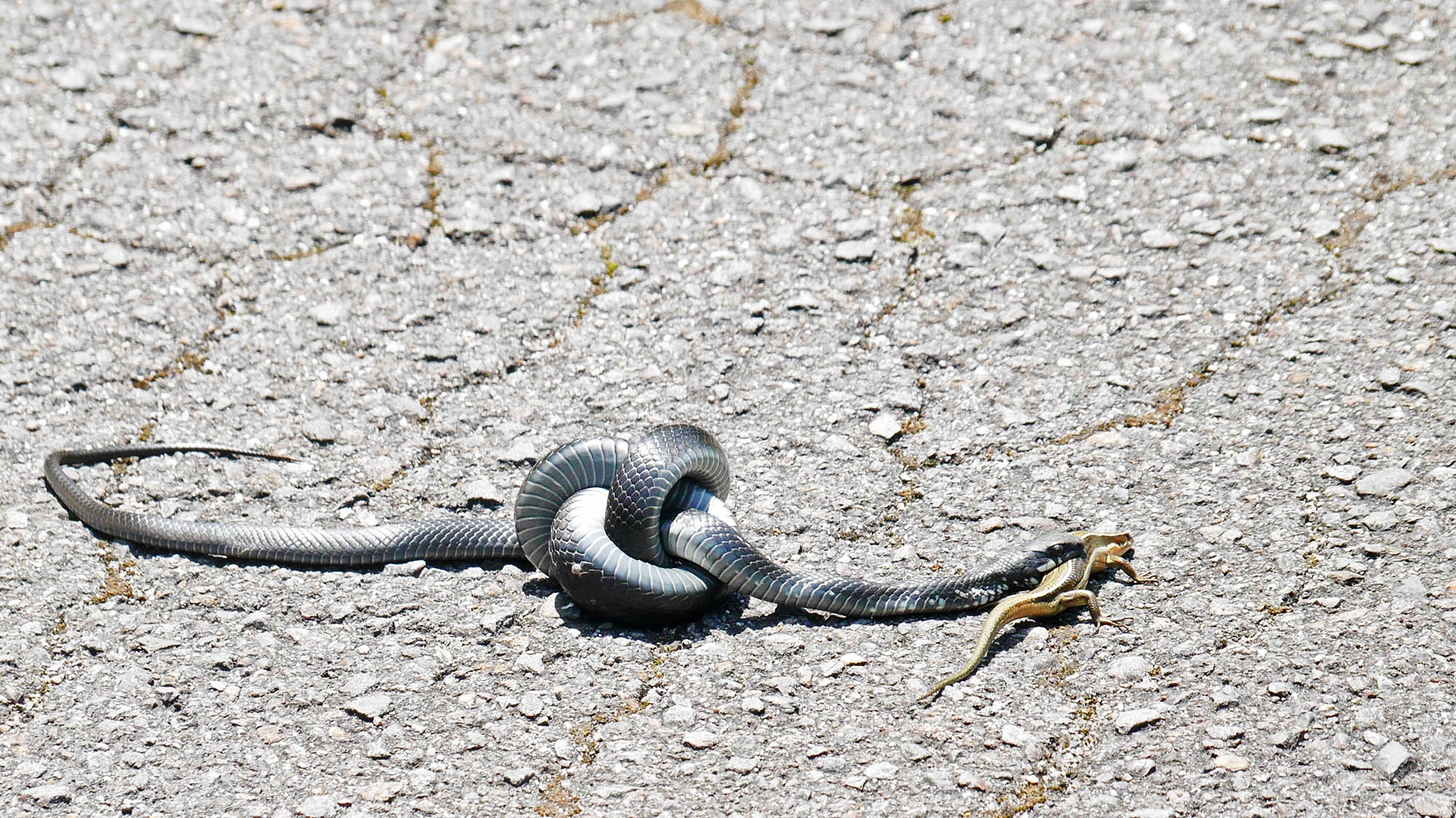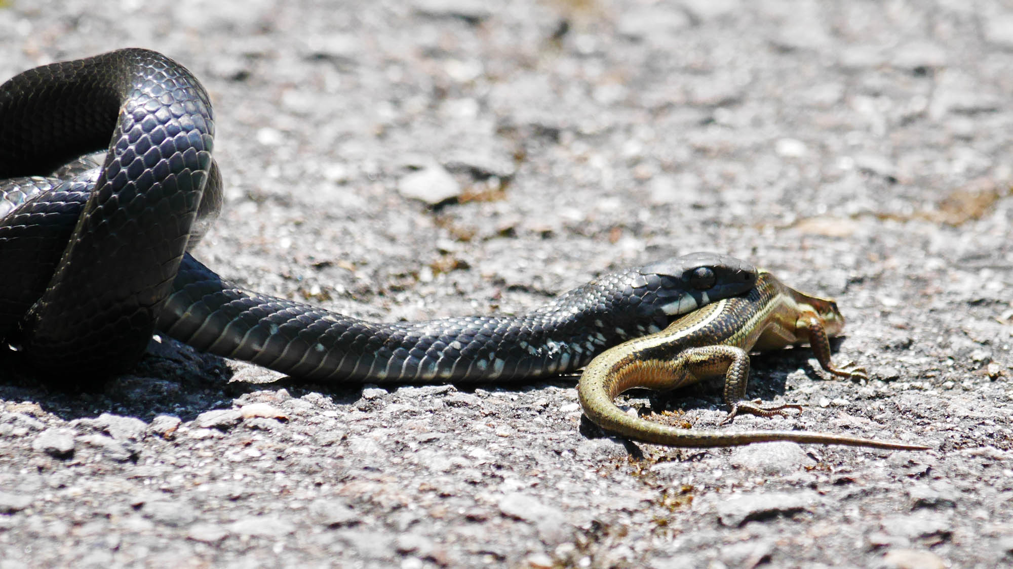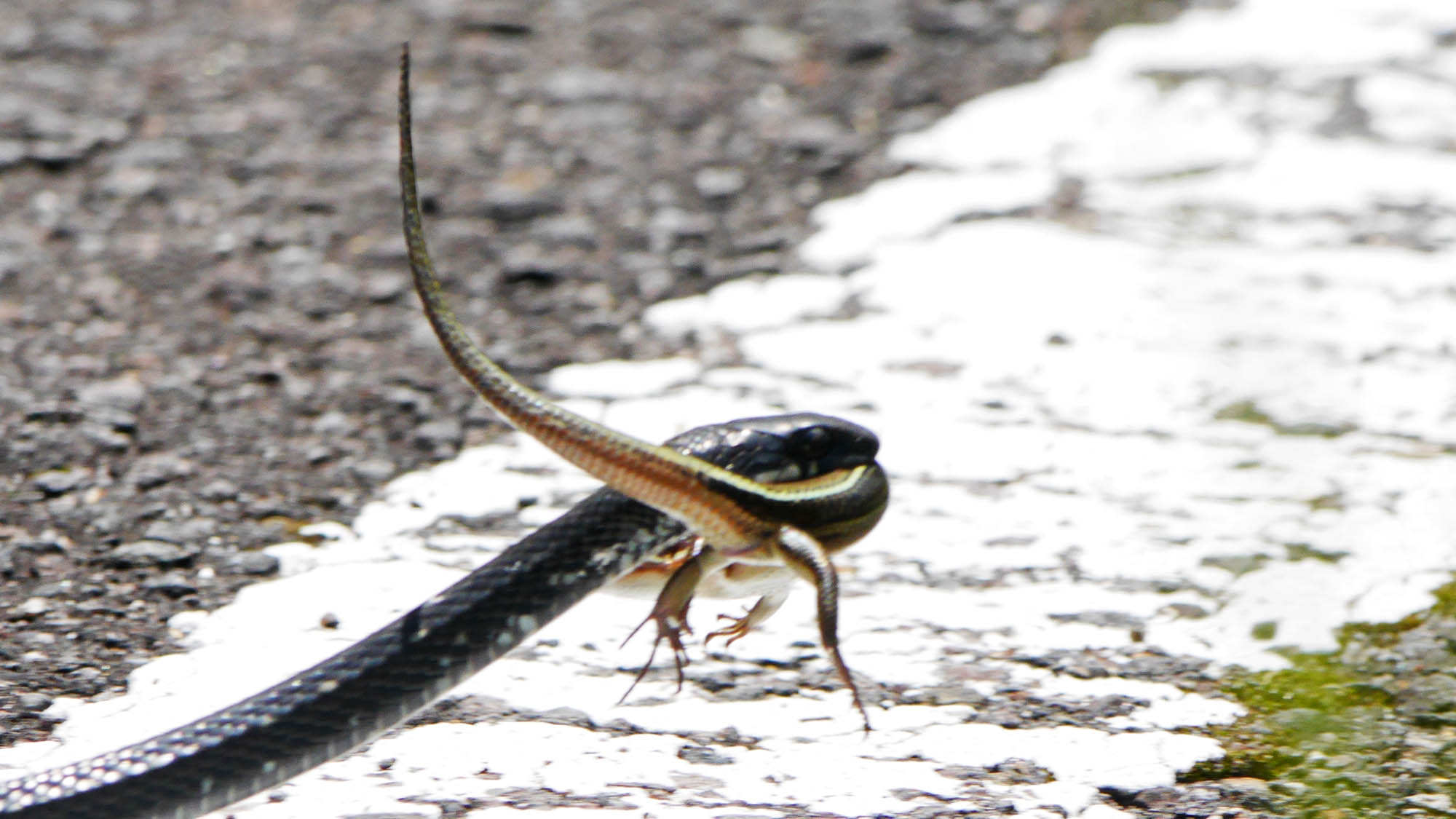 良く見るとヘビがトカゲを咥えて、自分で自分の体を巻きつけていました。