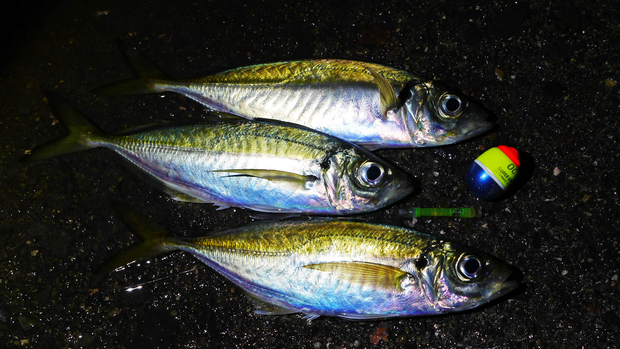 夜のアジは小型は15㎝位で、大きくても25~27㎝級でしょうか?交じりで良く釣れますが、エサを取られる事の方が多くて難しい。フカセ釣りなので岸壁の傍を重点的に狙うと、矢引きから一ヒロ程度で飽きることなく釣れ続き、最初はキープしていた18~20㎝クラスも、後半では全てリリースの対象になったのです。
