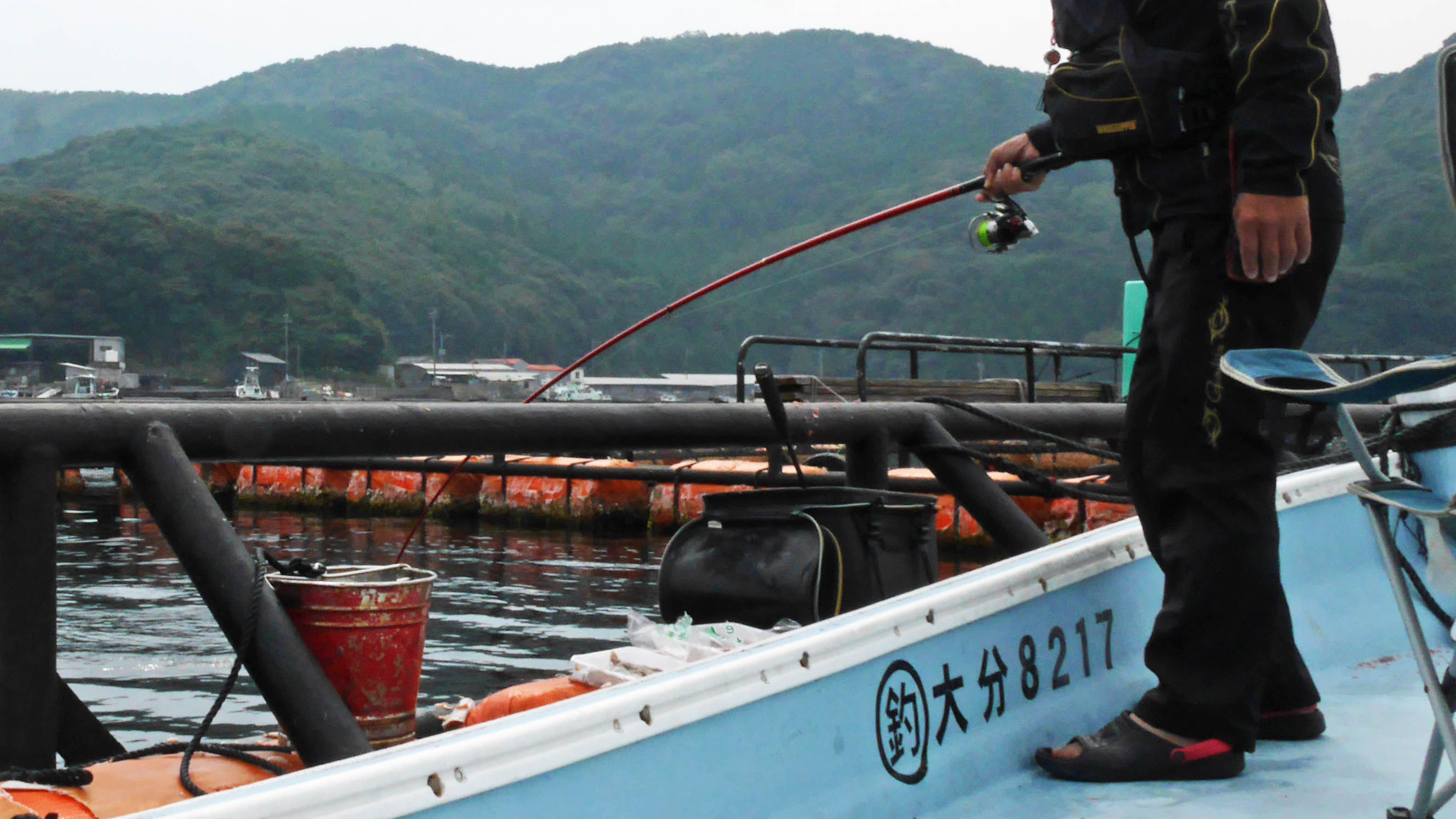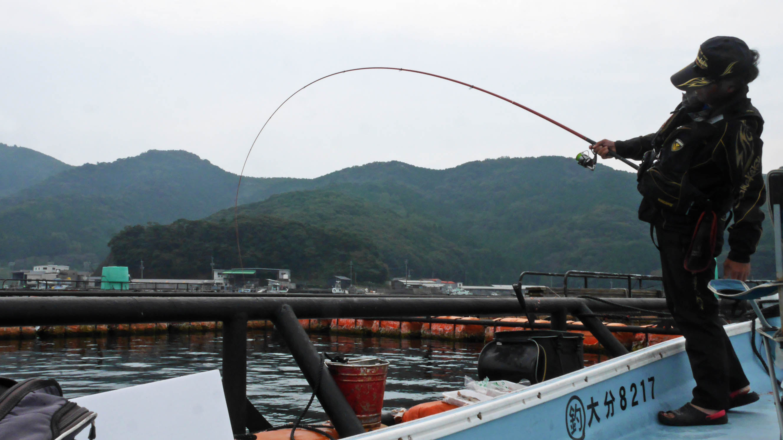7時集合15時納竿です。カセ釣りのポイントはシマアジの養殖イケスの隣で、3基ある養殖イケスに、骨筏を繋ぎ合わせて釣り場にしています。