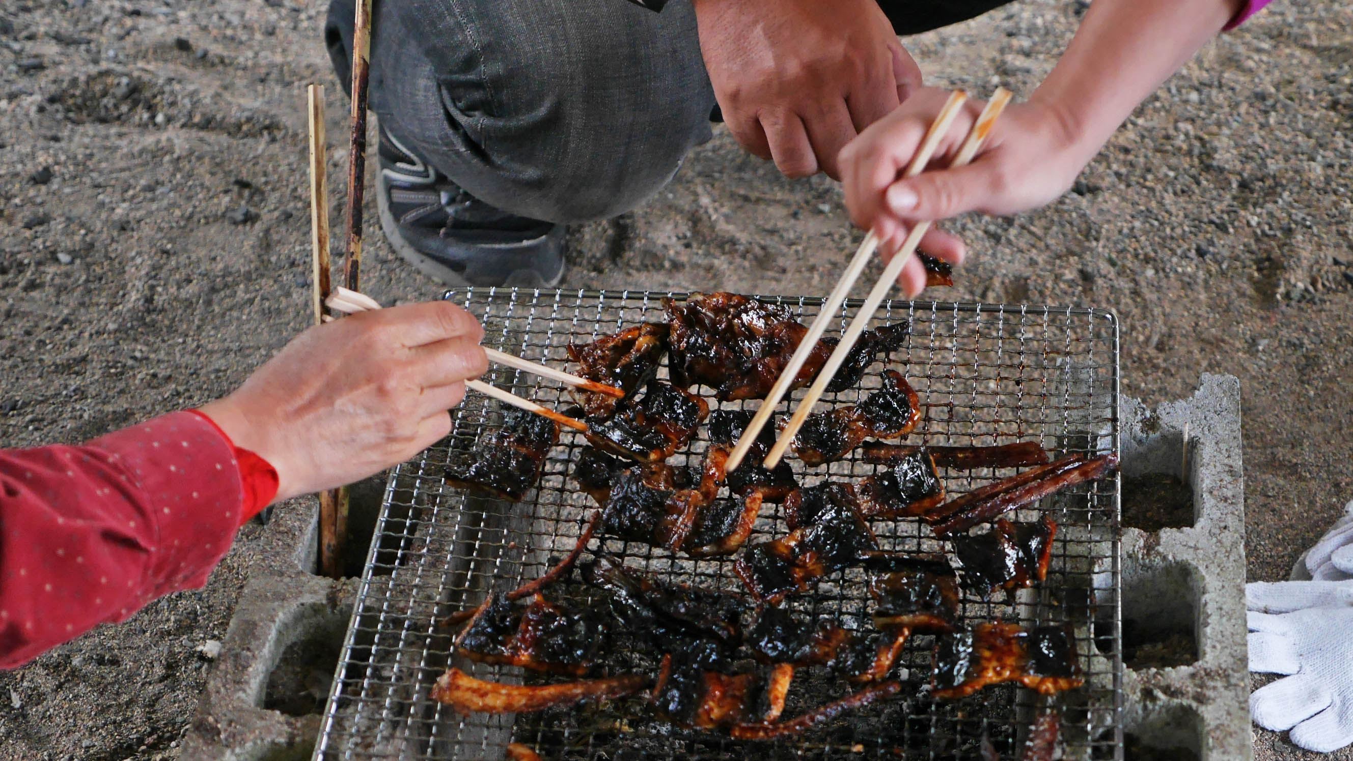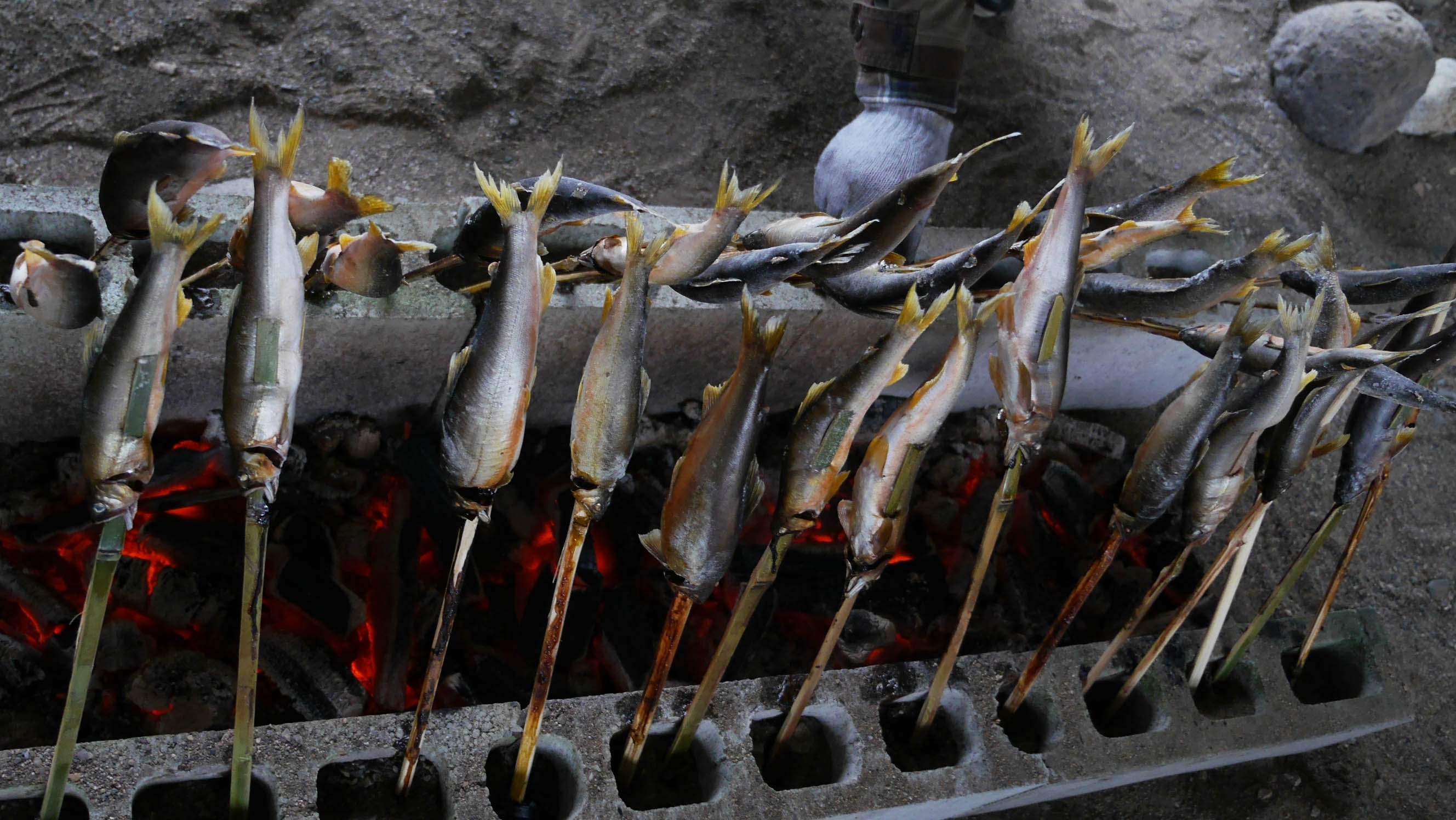 ブロックに砂を入れて竹串を立てると、アユは炭火で美味しく焼けます