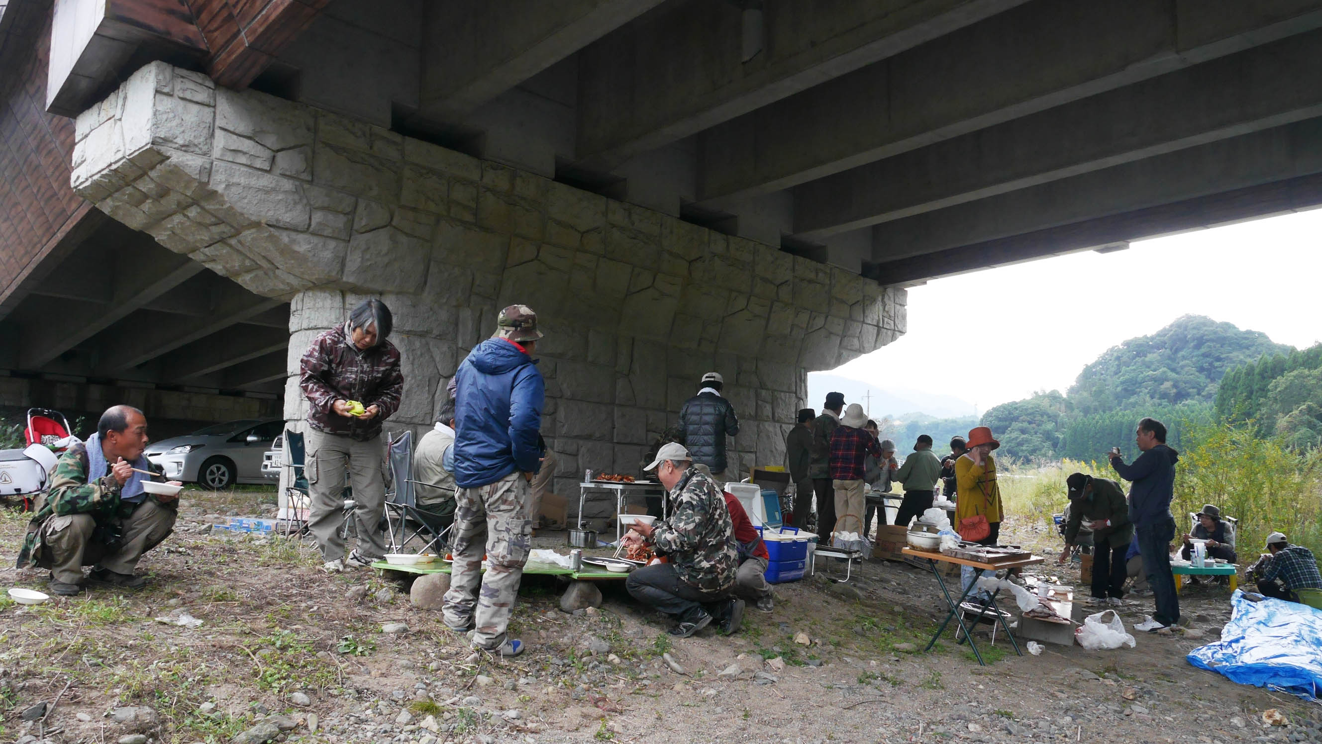 大野川と七瀬川のアユは串に刺して塩焼き。モクズガニは茹でたものとカニ汁・蒲江のマダイはバーナーで炙って霜降り造りと海潮汁・人気の猪鍋は2つほど、シメに2匹の天然ウナギのかば焼きは、身が18切れ・骨は10切れ・頭が2つで丁度30人分。私とのジャンケン大会で、勝者から順番に食べてもらいました。