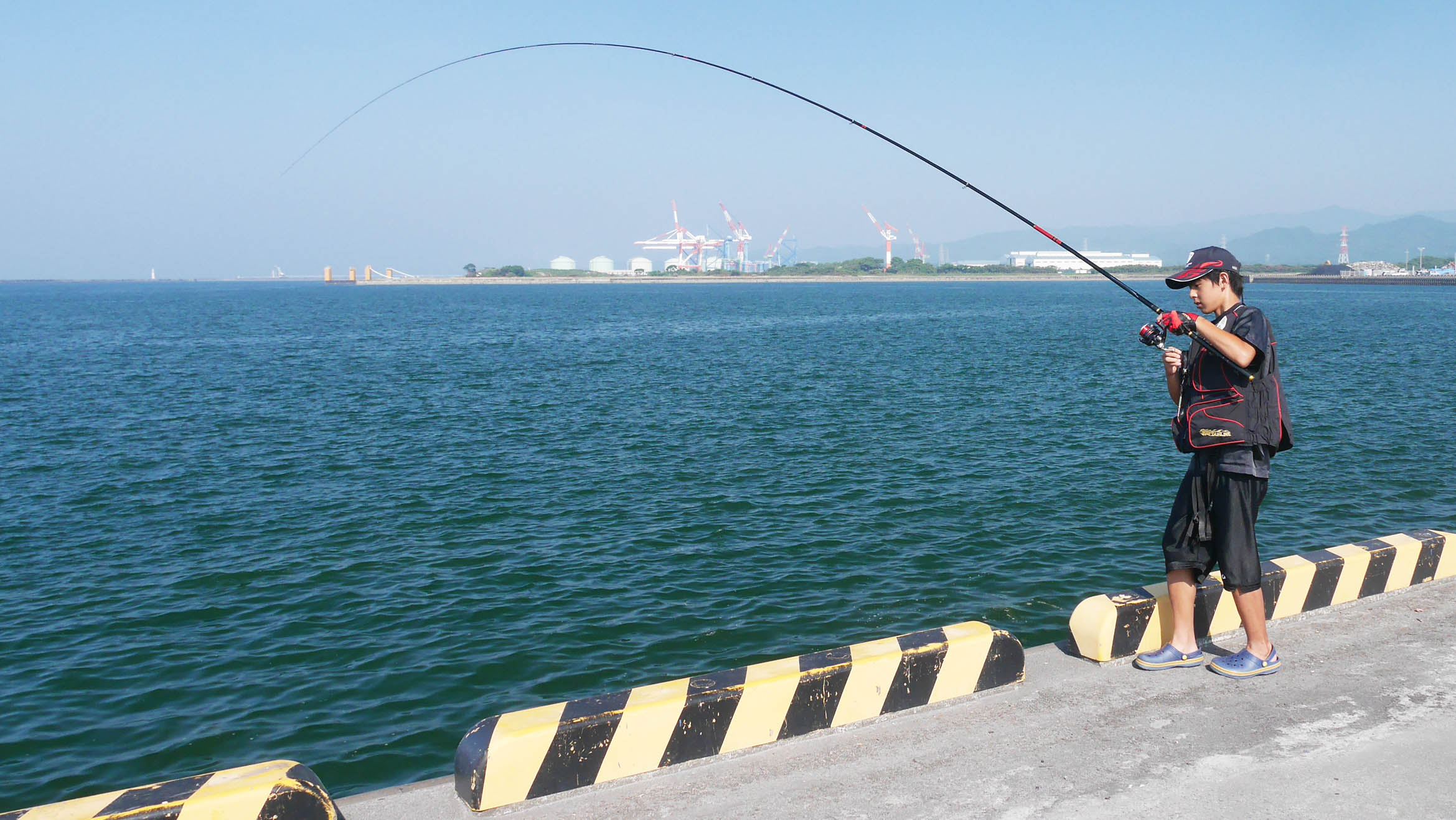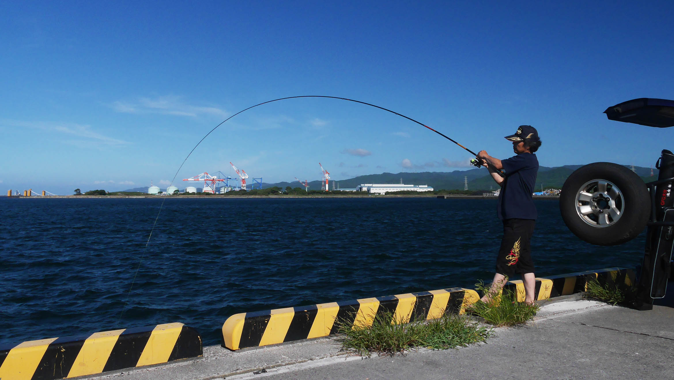 まだ14歳の彼は、15年前の木村真也君を彷彿させるフレッシュな風貌。13時に集合してマキエを作って私の車で大在公共埠頭へ・・・。東向きの倉庫前には釣り人の影がありません。“梅雨明け10日”のカンカン照りの14時頃は酷暑がピークです。