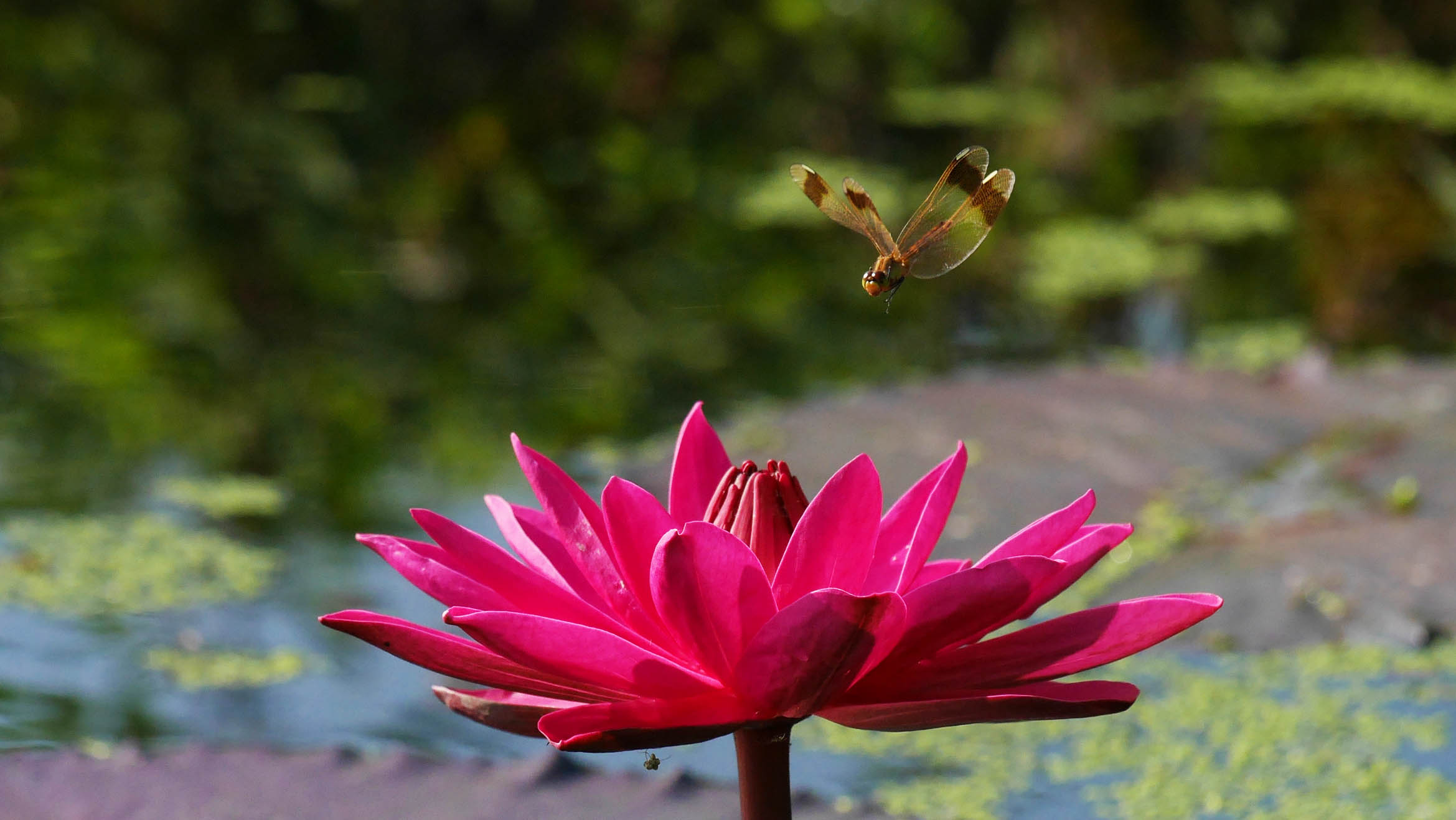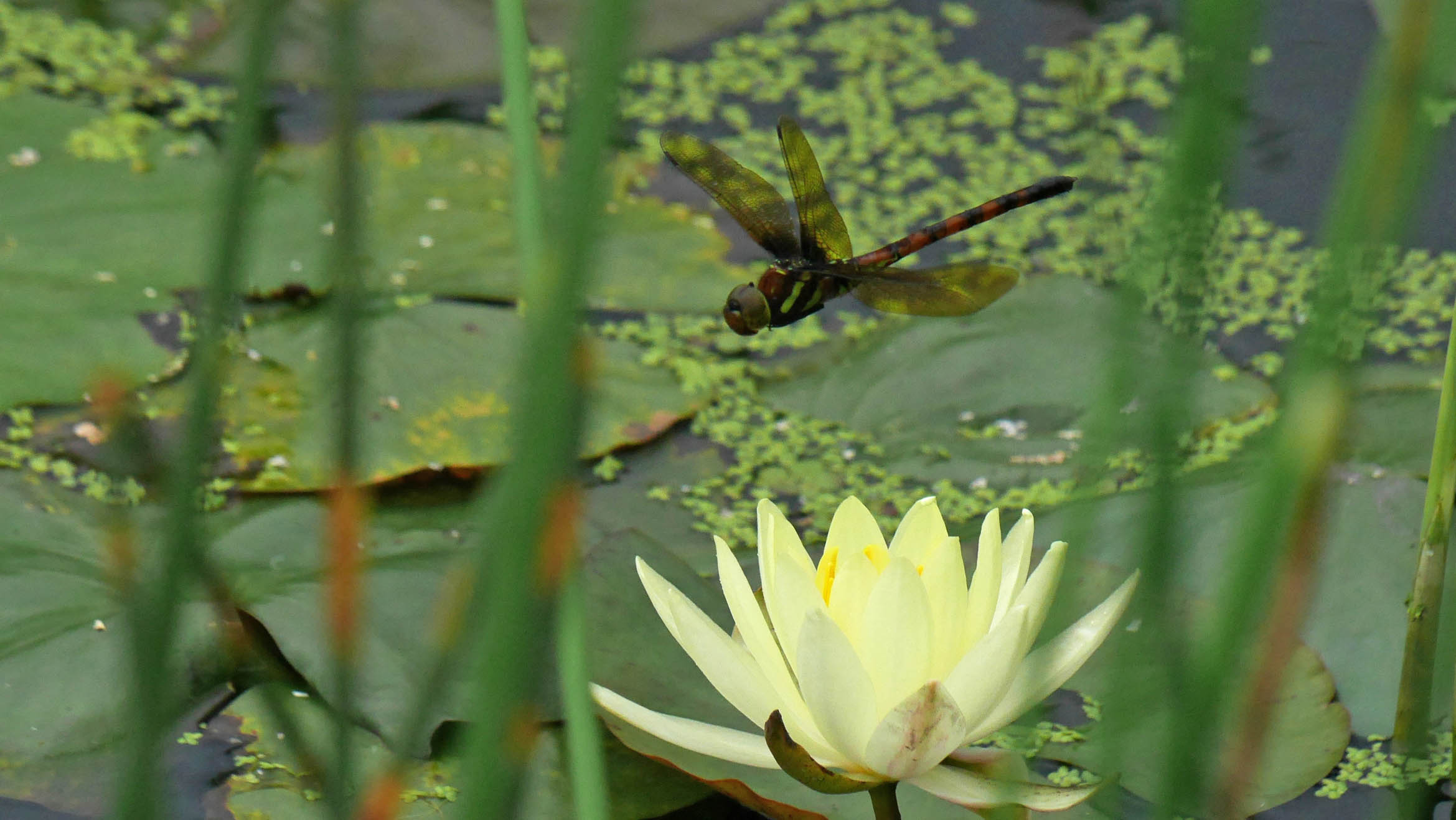 夜咲きのスイレン、朝遅くまで咲いているのでミヤマアカネが・・・