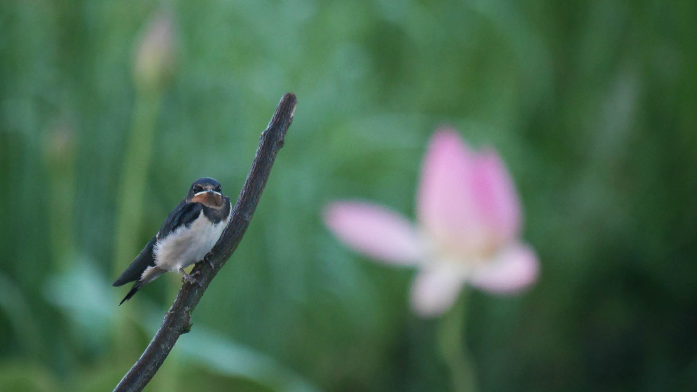 ハス近くにあるカワセミ用のお立ち台。なぜかツバメの仔です