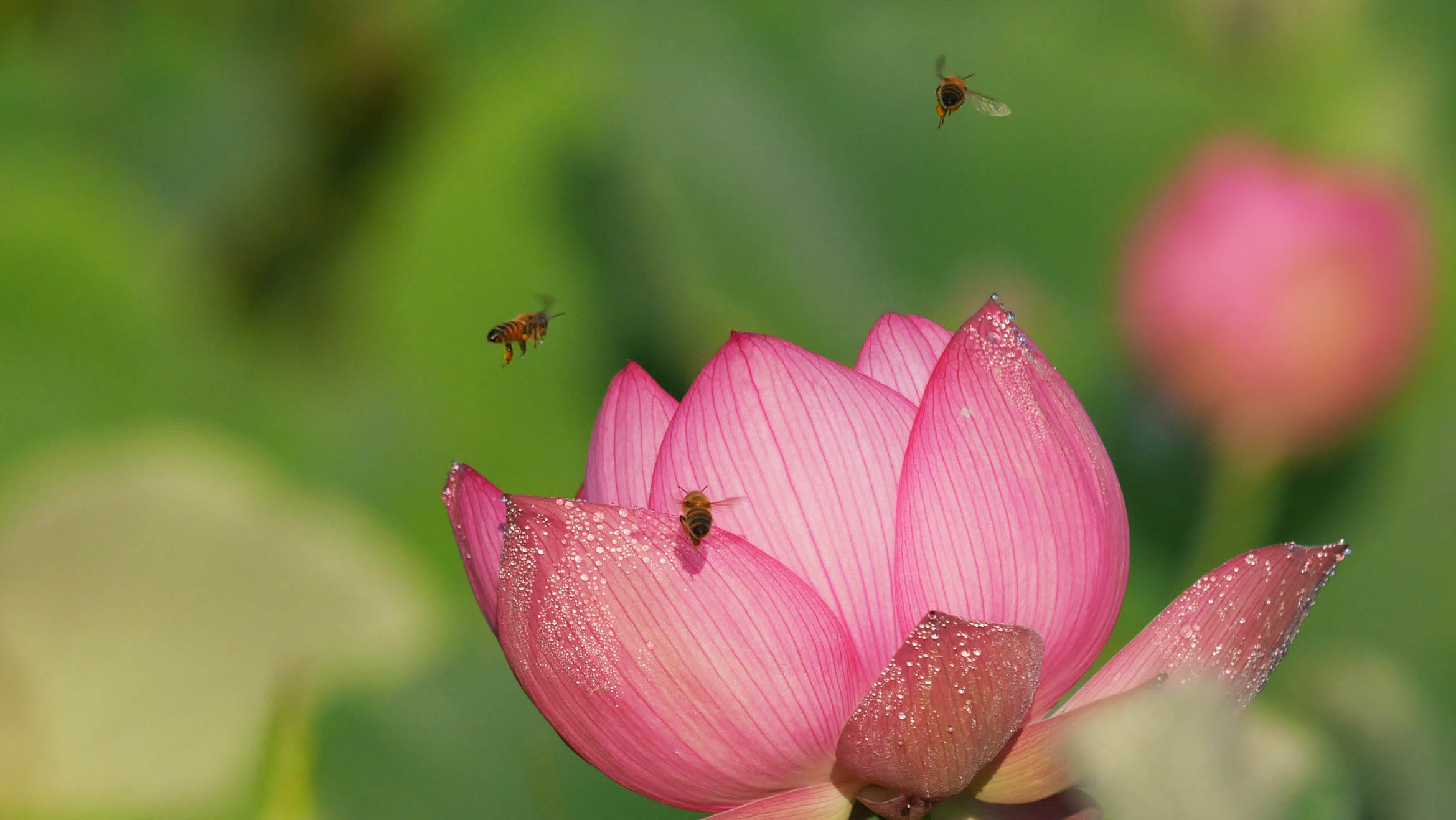 朝のハスは綺麗です。ミツバチがたくさん・・・