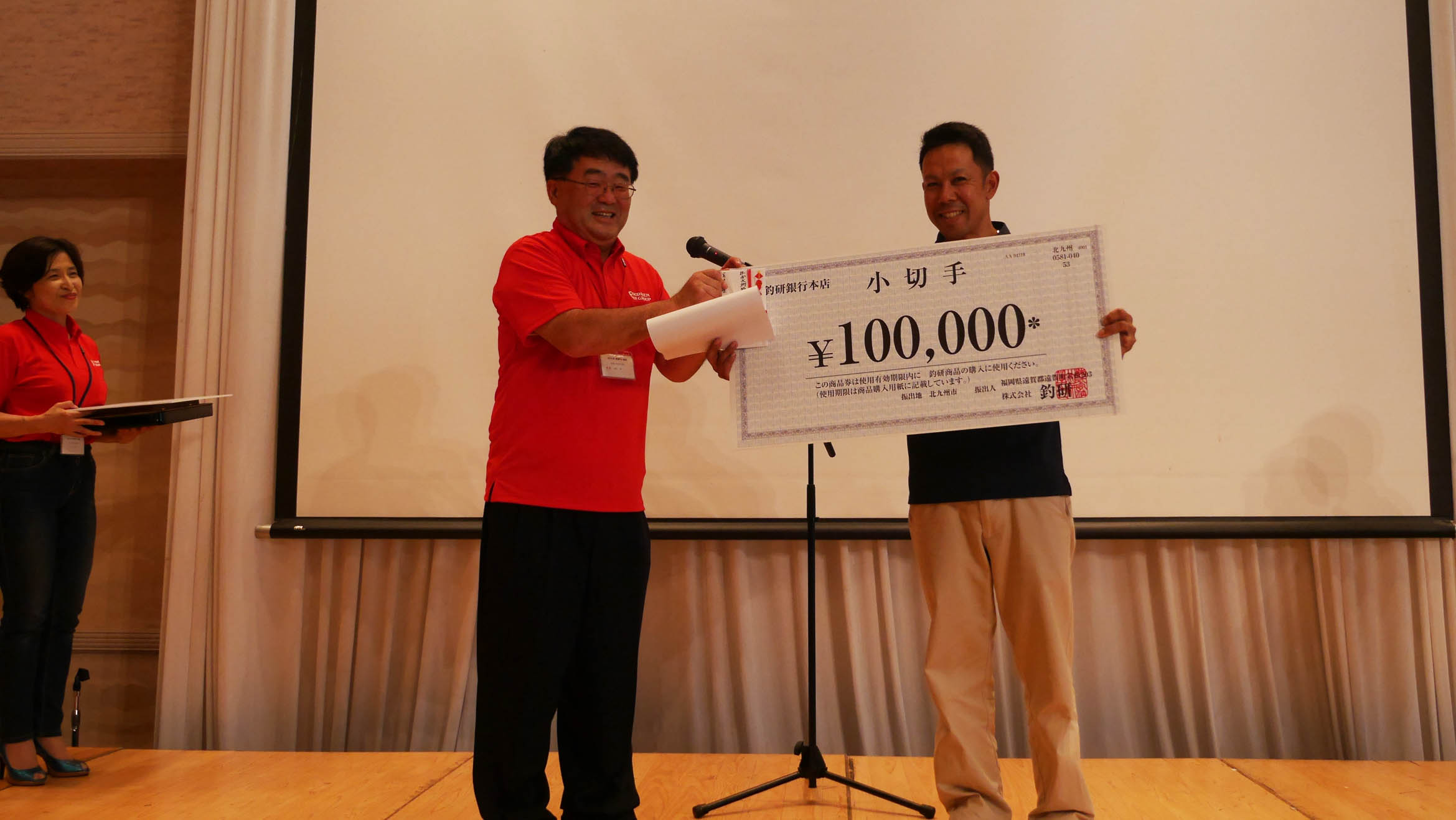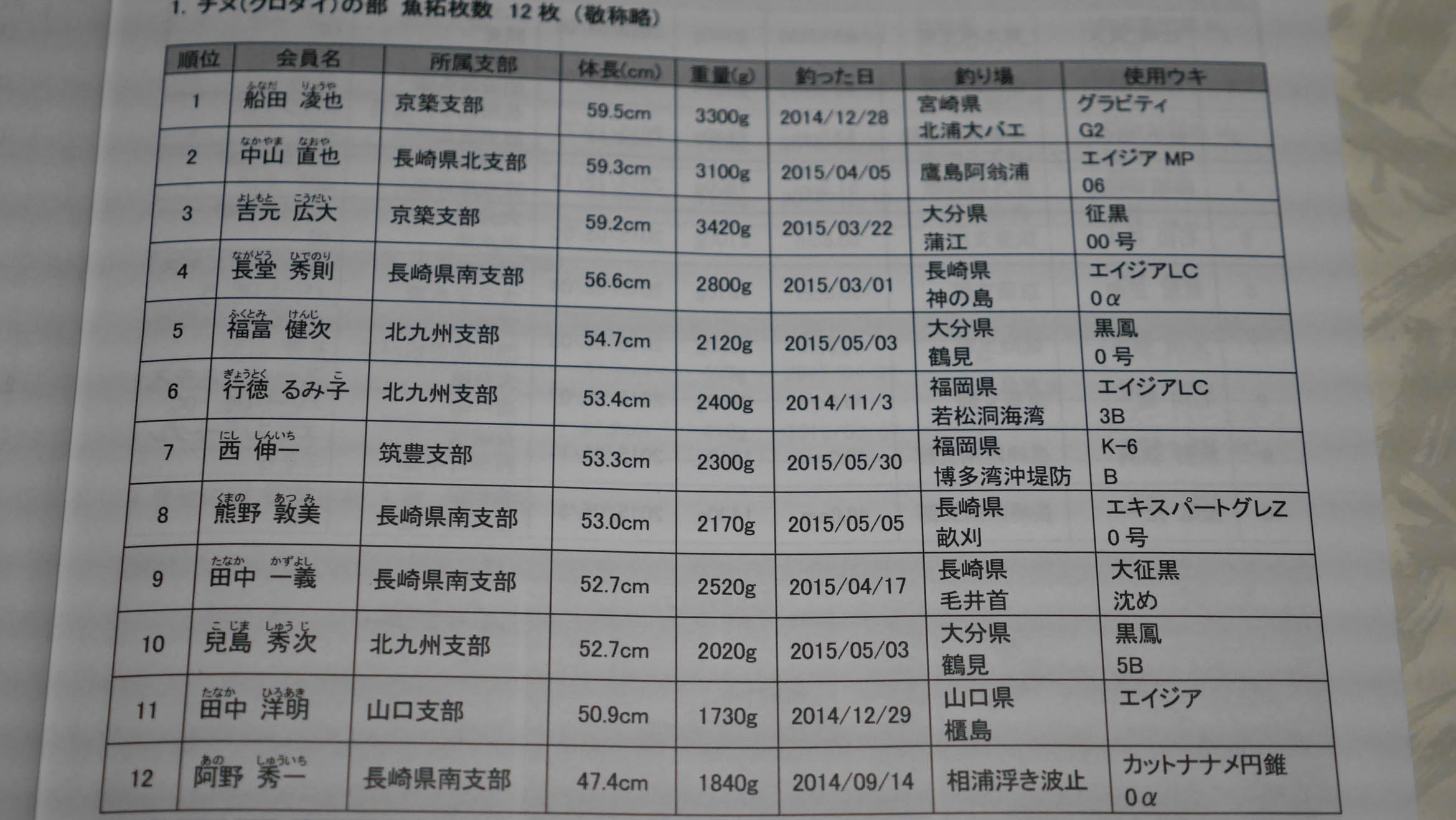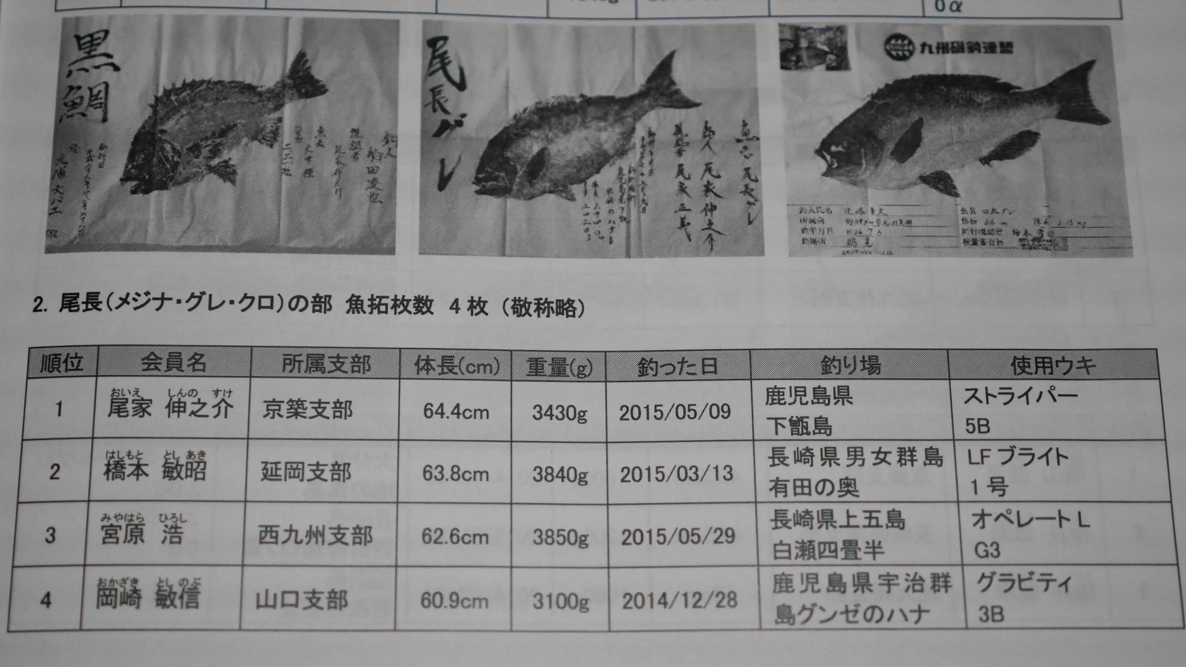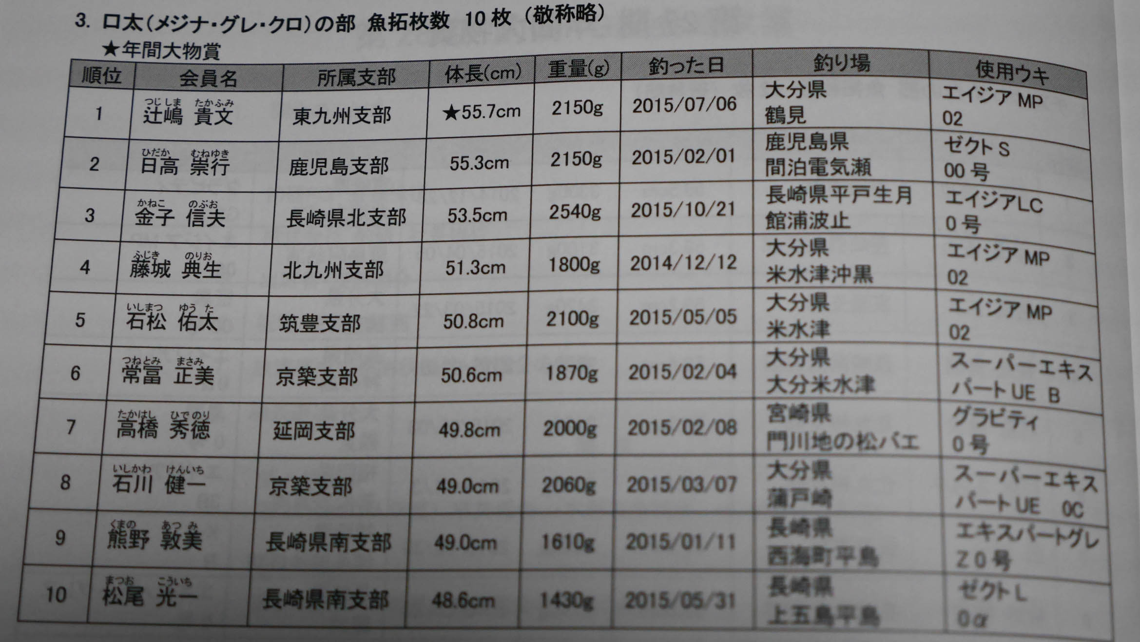 今年は東九州支部から辻嶋君がグレの部で優勝、その長さは55.7㎝でした。これは釣研FGの歴代記録の55.6㎝を1㎜ほど更新したサイズで、新記録の更新と特別大物賞の表彰対象になりました。よって(株)釣研から10万円の賞金もゲットです。