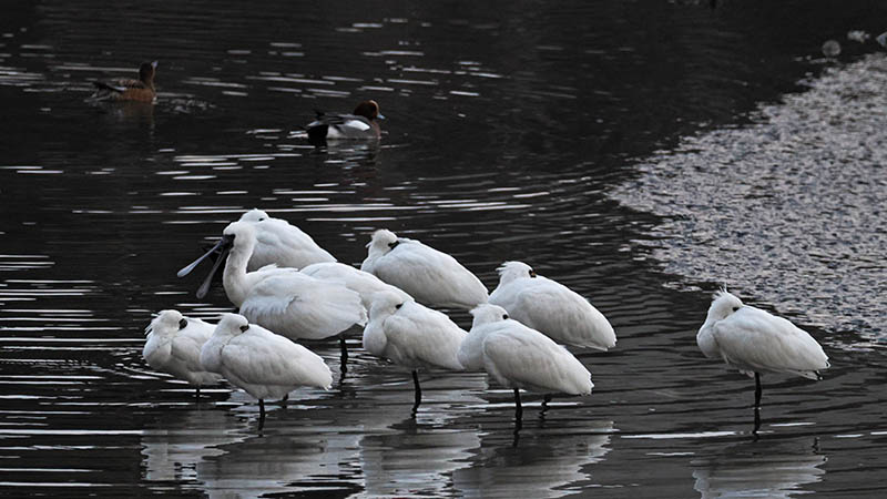 集団お眠むのクロツラヘラサギ、上はヒドリガモ♂♀