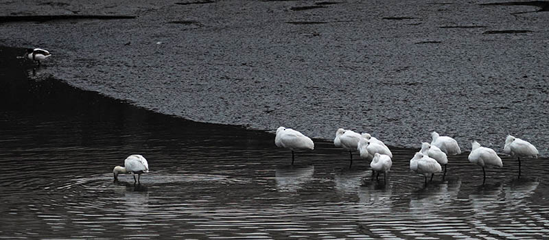 左ヘラサギ、右の集団はクロツラヘラサギ、左上はツクシガモ