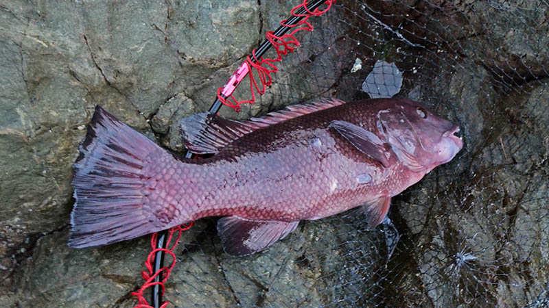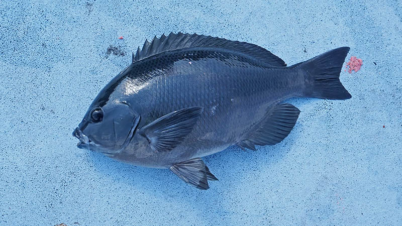 10時頃が満潮の潮止まりで、皆で早い昼食タイム。食後は“ラクダ”に近い場所へと移動して1時間ほど実釣会。3ヒロくらいで3匹のクロをゲットです。