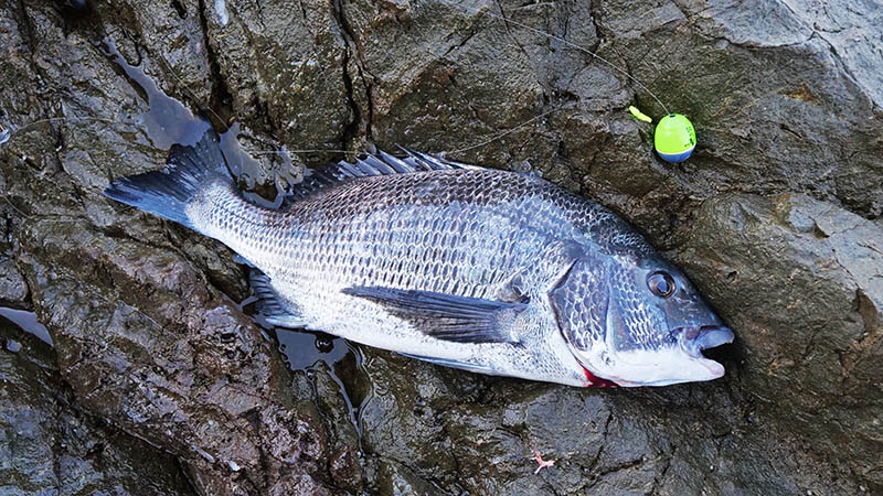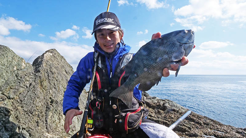 その後は少し休んで南側の飛び渡る低い足場で竿を出すとココでもクロ。先端の神出君も仕留めてくれます。
