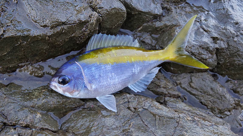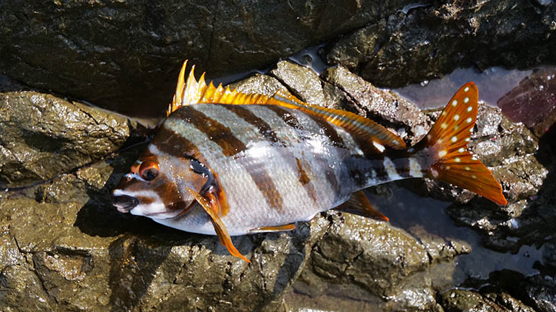 “マサカリの壁”は足場が斜めになっており初めての磯。満潮から下げに変わっていたので、私は左側の低い場所に飛び移って釣りを開始するとカンダイ。