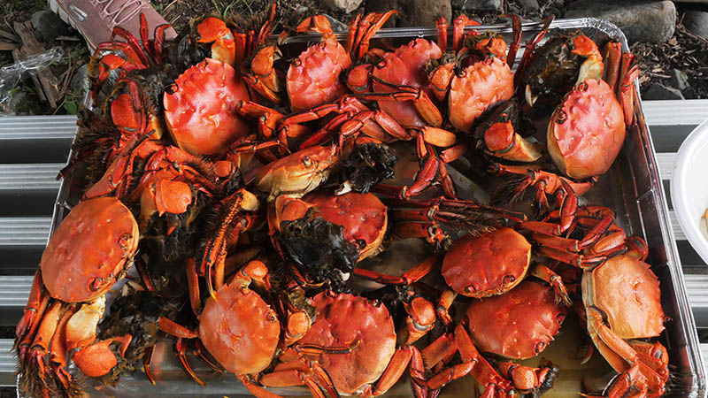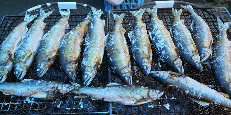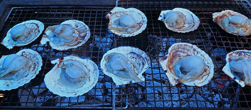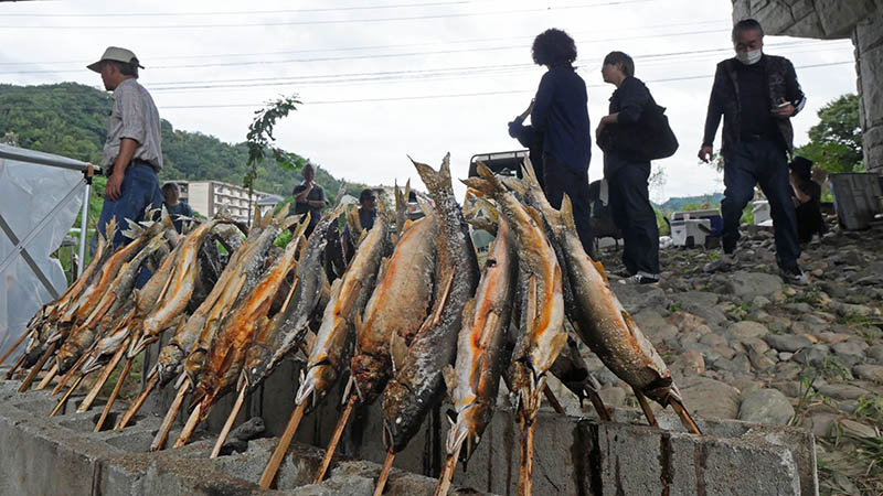 雨の落ちる朝は民宿でゆっくりと寛ぐ。早朝から福森さんや中島君が鮭を釣れる場所を探していて、伊達漁港の消波ブロックで中島君が一本仕留めた。