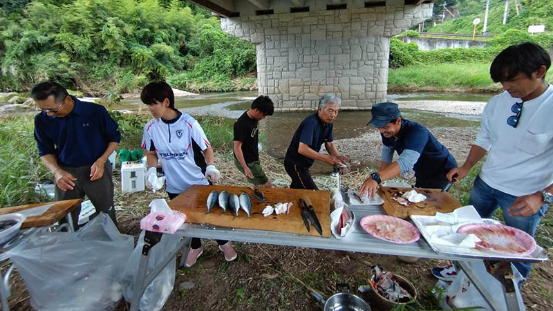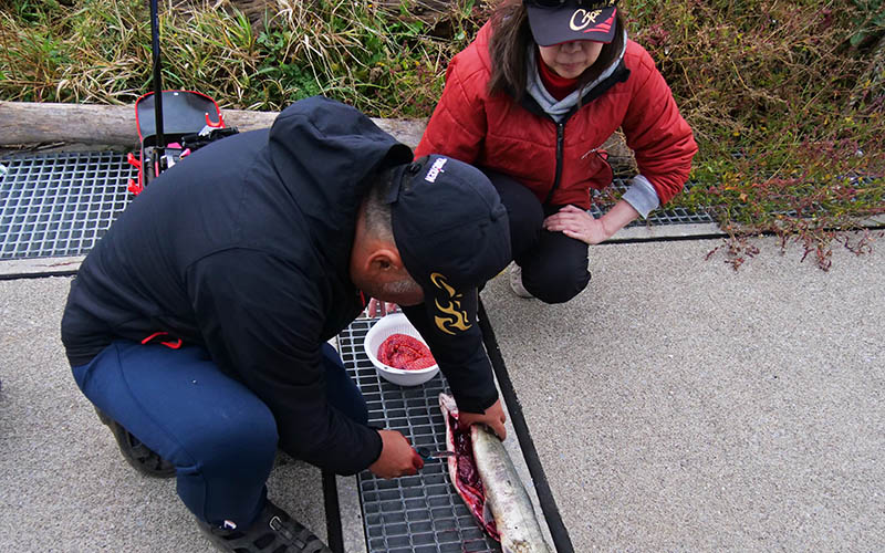 中島君が釣った♀の鮭を福森さんが捌く(翌日食べるイクラ作りの為)