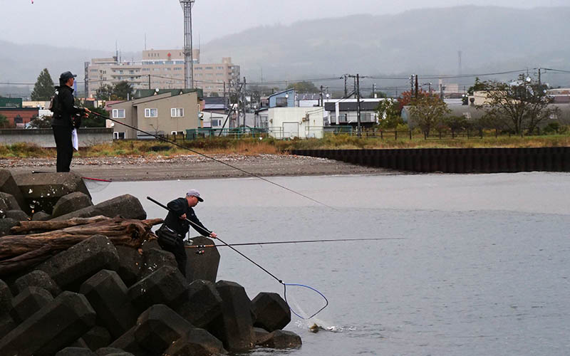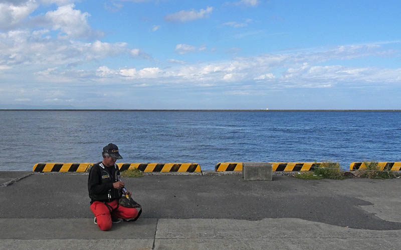 とうとう北海道の釣り最終日に突入。伊達温泉での朝食後は室蘭の黄金町にあるチマイベツへ移動、河口を降りて石積み波止?の先端で竿を振りました。