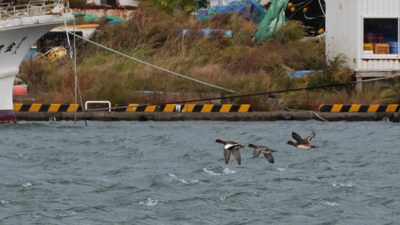 湾内でもかなりの強風、風上に進まない3羽のヒドリガモ