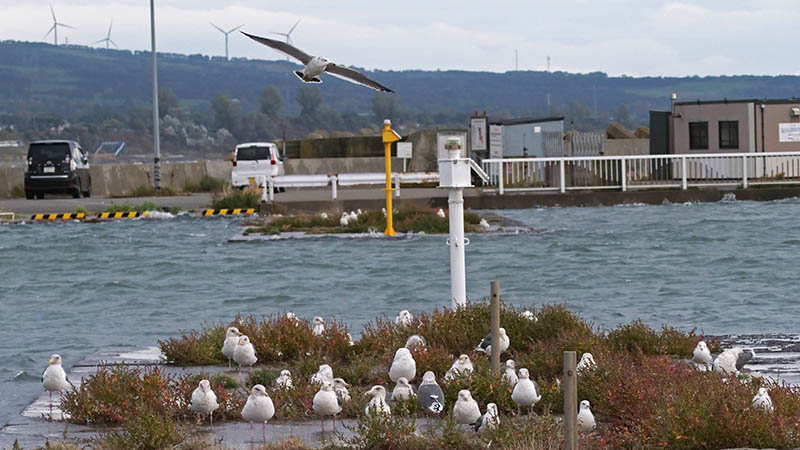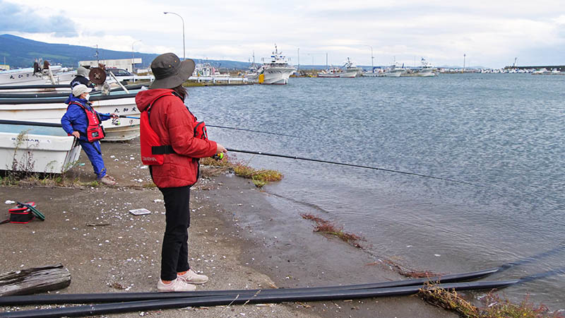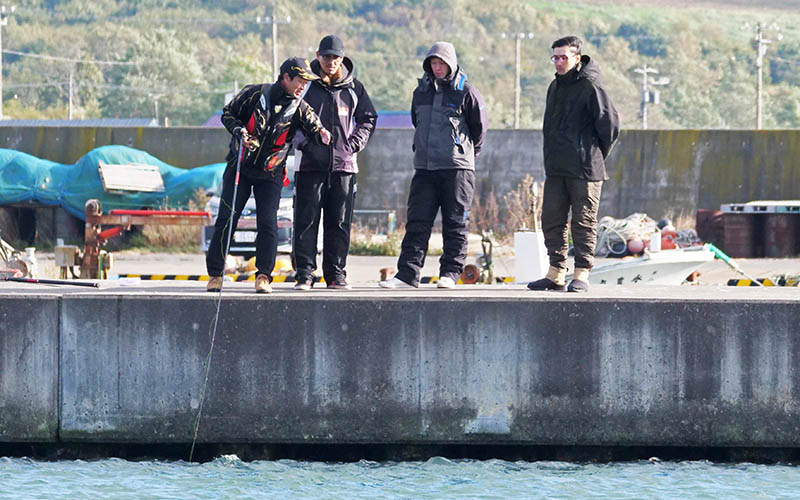 9時過ぎの釣り始め前に湾内中央で鮭の鰭が動くのを確認、インタビュー中にも岸壁近くで1匹が跳ねるのを確認しましたが、その後は何も変化なしでした。