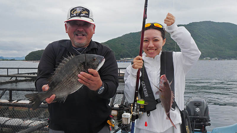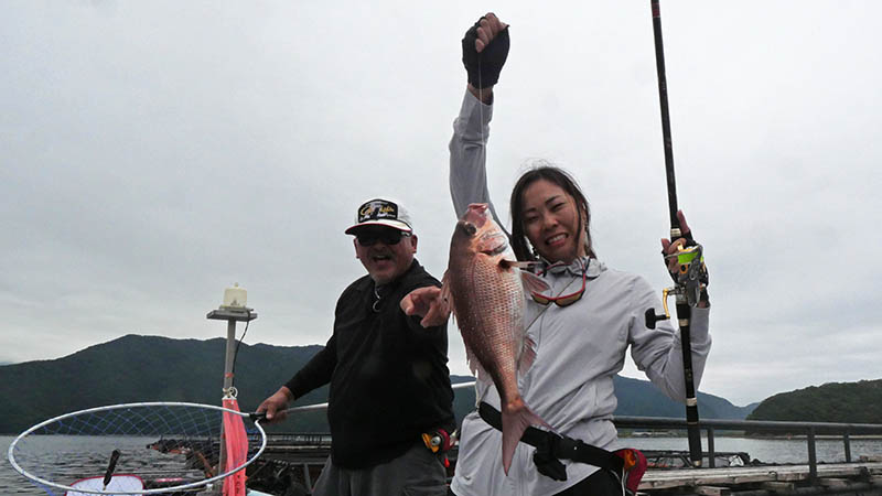トータルで30分弱釣った末松君、その横で釣りガールの初マダイ