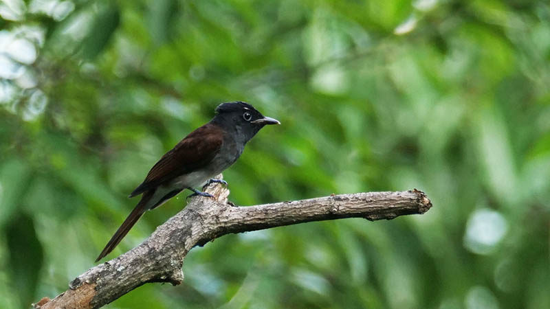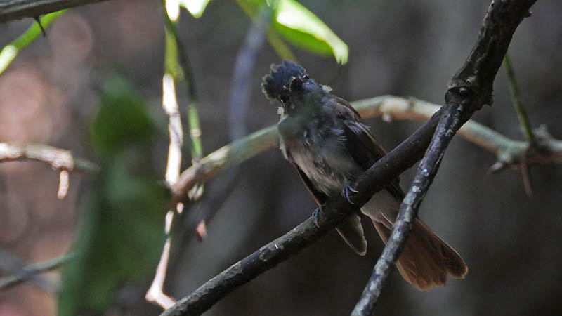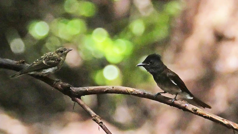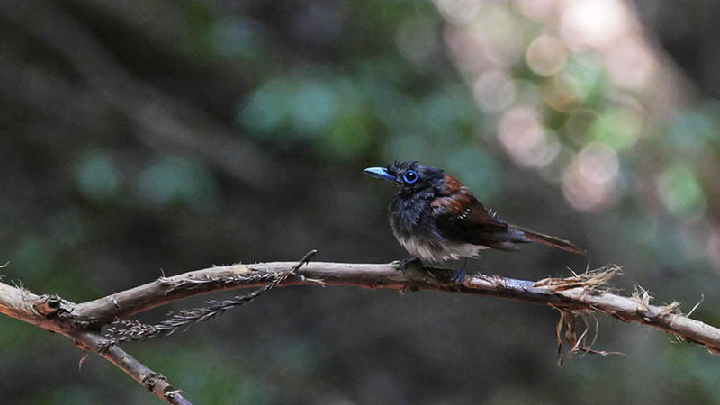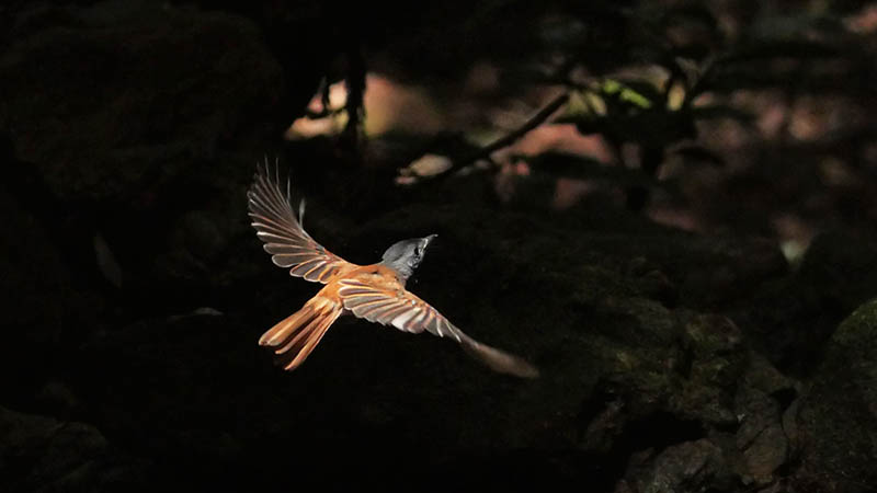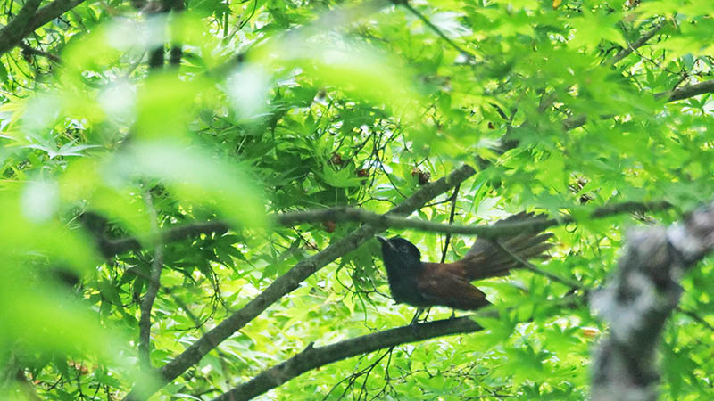 サンコウチョウの水浴びは、空中から溜り水にダイビングして行います。
