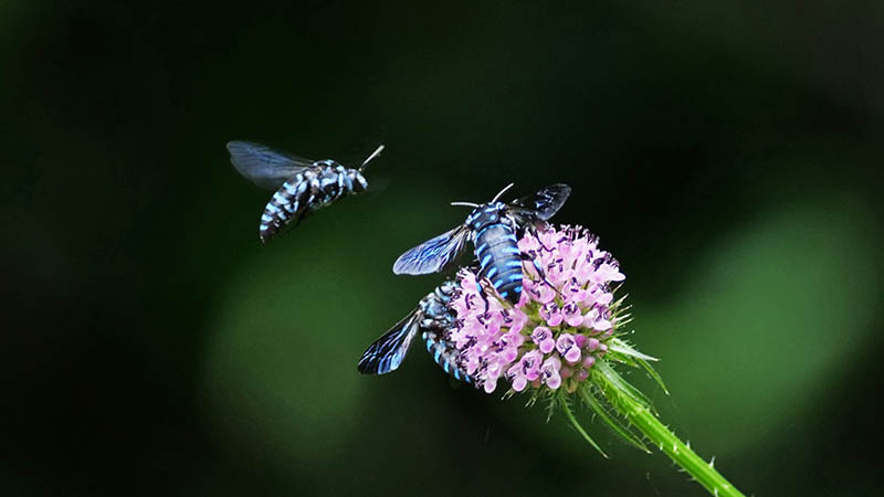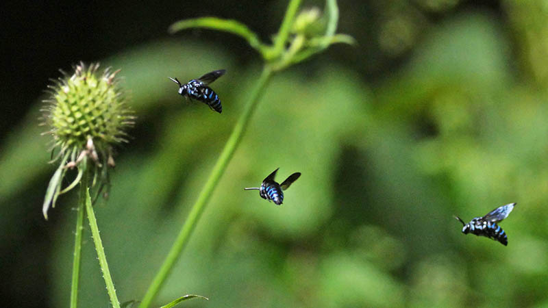 今朝9時30分に確認すると、3匹のルリモンハナバチになっていた。
