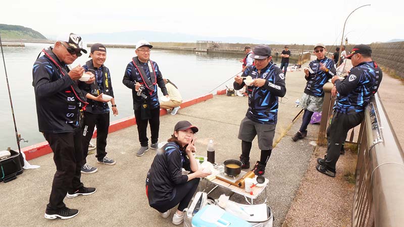 30日のテスト釣行は9時から14時頃迄の計画で、昼飯はコンビニ弁当を購入して持ち込む予定でしたが、料理の普及活動もしているユッコさんが、おにぎりやソーメンを沢山持って来てくれて、皆でパク付きました。