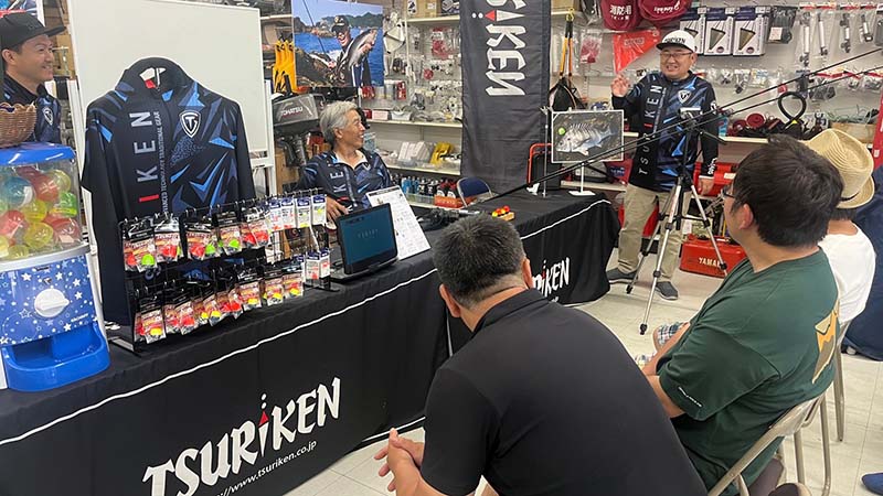 講義には遠く苫小牧からも参加して頂き、やる気満々の釣り人達に感謝です。店の外では、借用して持ち込んだアテンダーⅢやマスターモデル尾長などの竿曲げ体験。また、翌日のテスト釣行の最後にも竿曲げ体験をして頂きました。