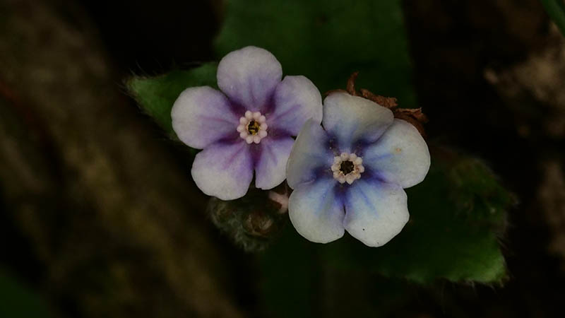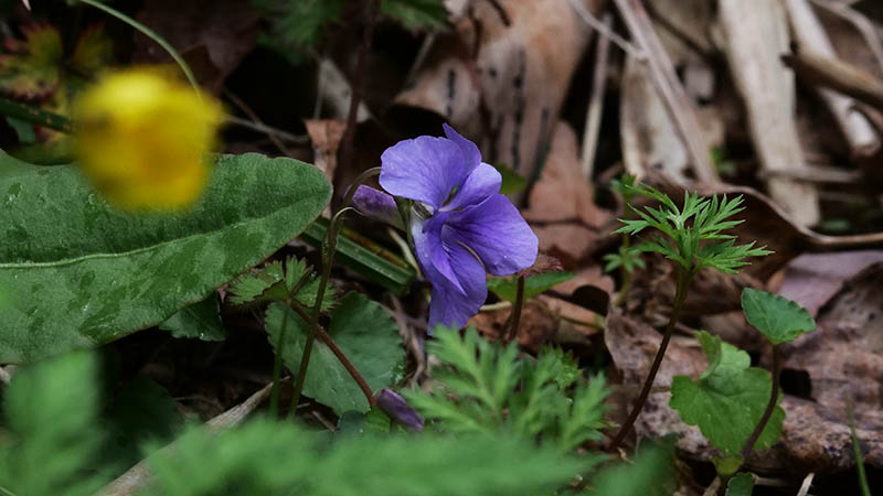 タチツボスミレの仲間、手前は福寿草、ニンジン葉っぱはヒゴスミレ