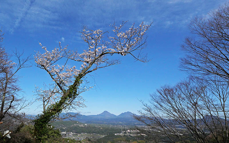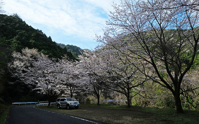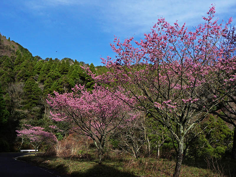 更に下って、鶴見岳・由布岳を望めるカーブでは染井吉野が少し。