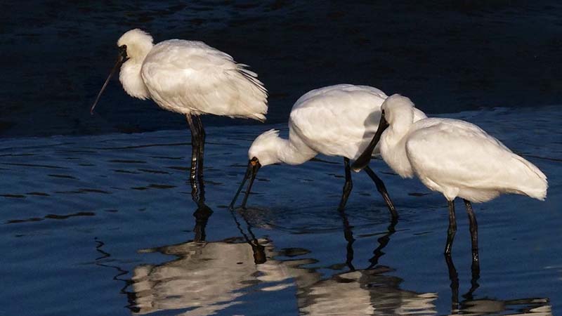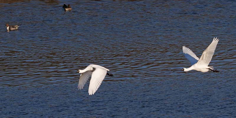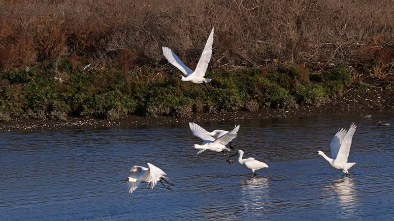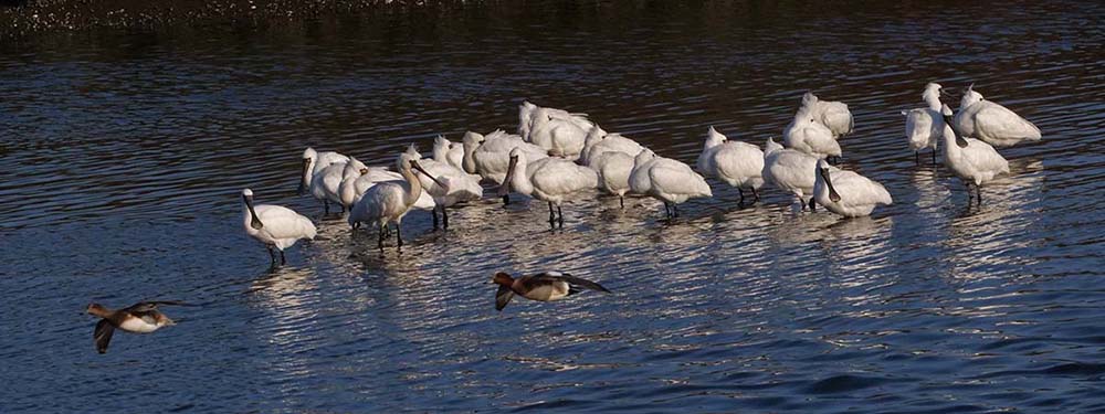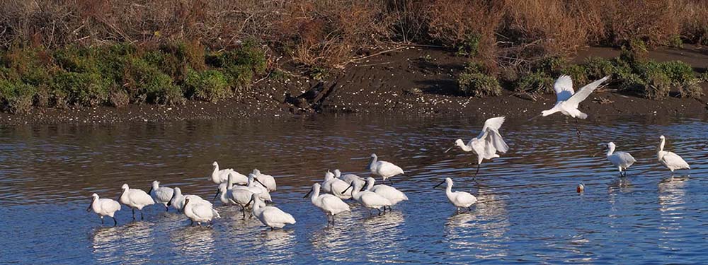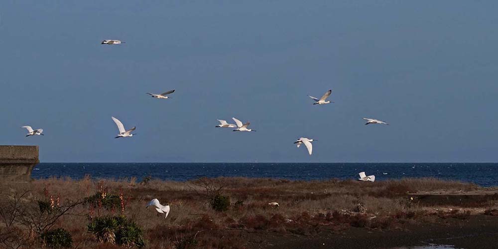 中津で河口を覗くとクロツラヘラサギが6羽、更に増えて22羽ほどに。