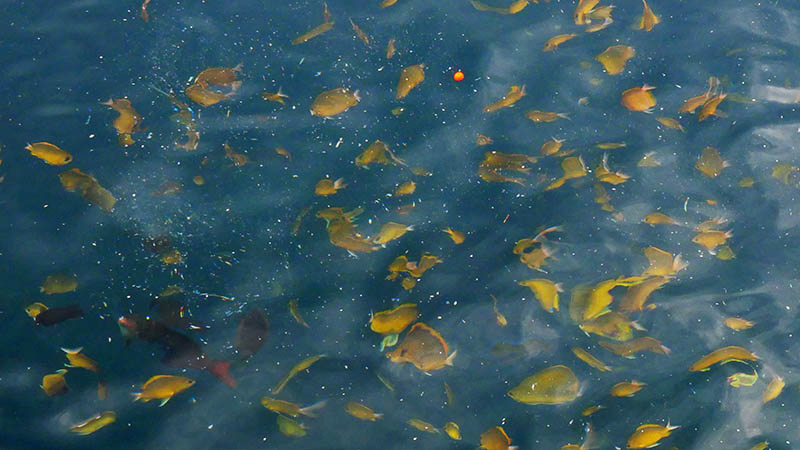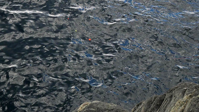 最後の一時間はフカセ釣りでマダイ狙い。タカベが多いので、30~40m沖にマキエを20杯以上打って、その潮下20m~30mを0cウキにBのガン玉を打った仕掛けをダイレクトに投入するも、ボイルオキアミを盗られるという凄さ。