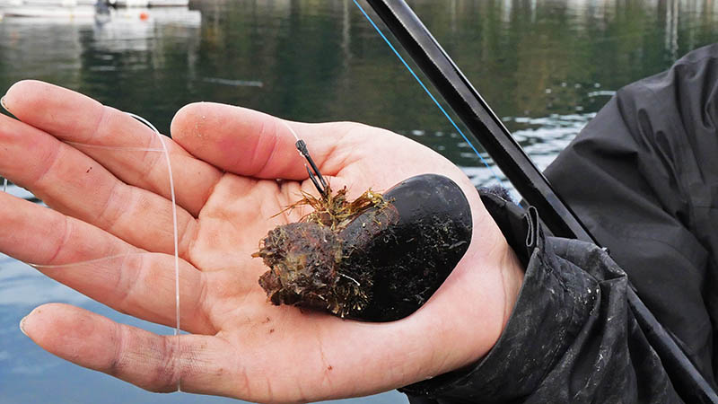 イカはエサ持ちが良いけど、もっと良いカラスガイを使う事に。割ったカラスガイを撒きながら、手頃な大きさのカラスガイをエサにゆっくり落とすと、案の定アタリが出たので送り込んでアワセを入れたけど鈎掛りせず。