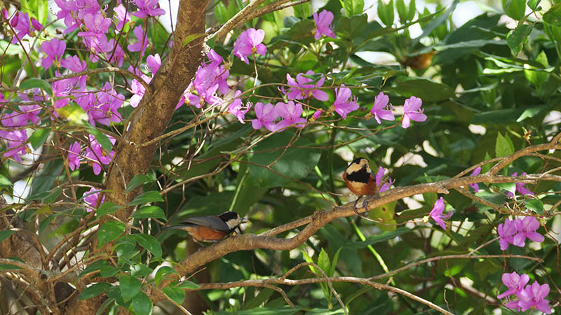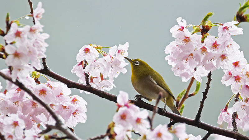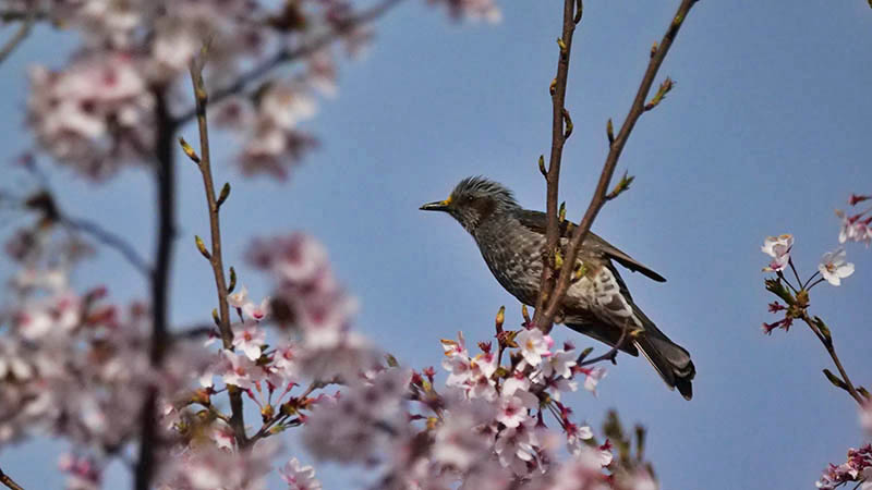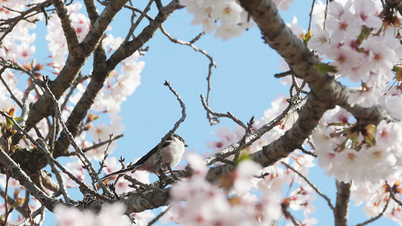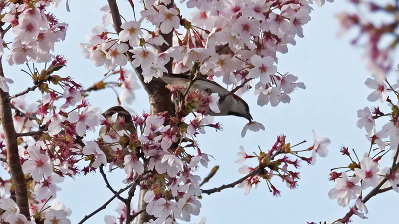彼らは桜の蜜が好きらしく、花を千切って蜜を舐めている様に見える。