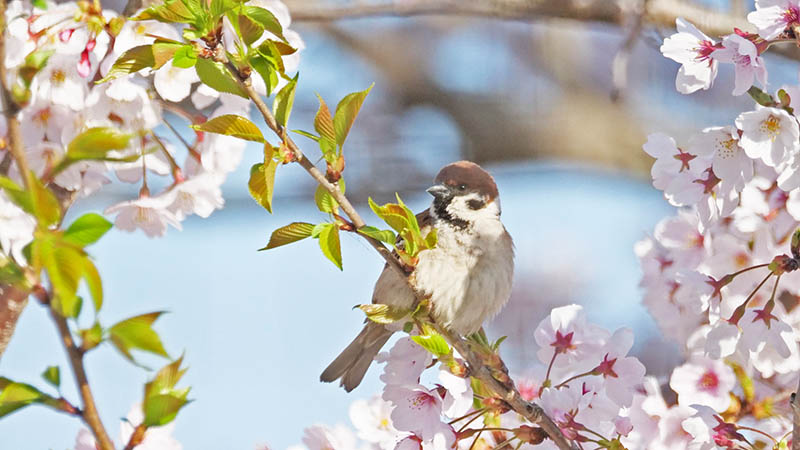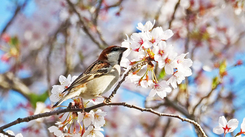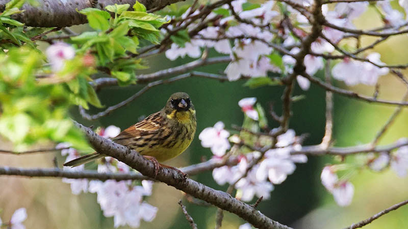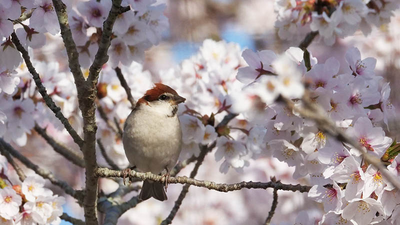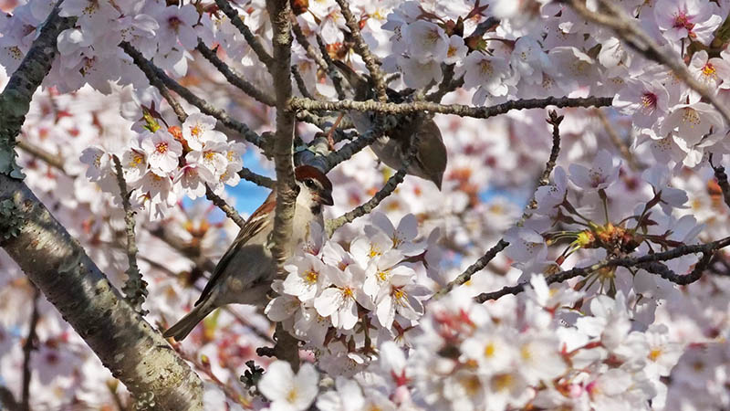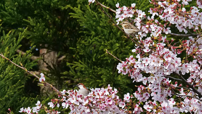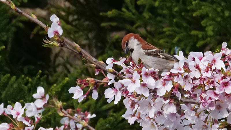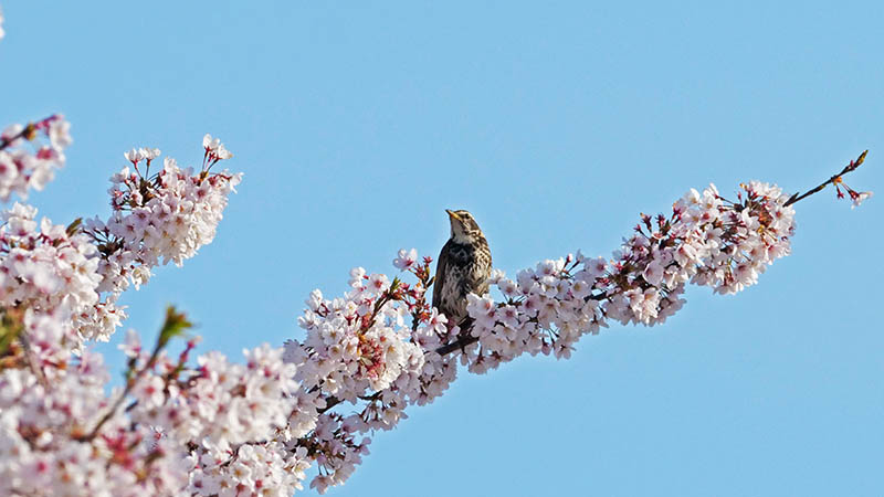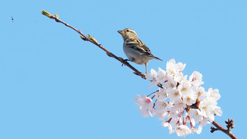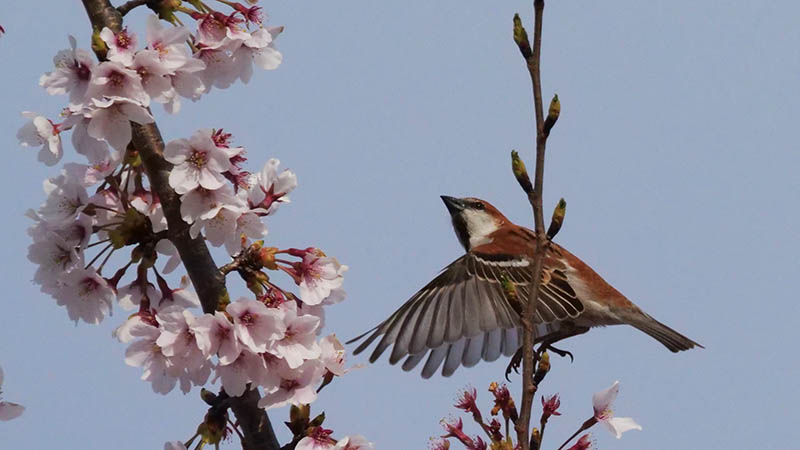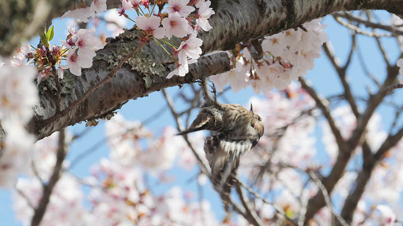 ソメイヨシノの花が咲く頃、冬鳥のニュウナイスズメが通過する。