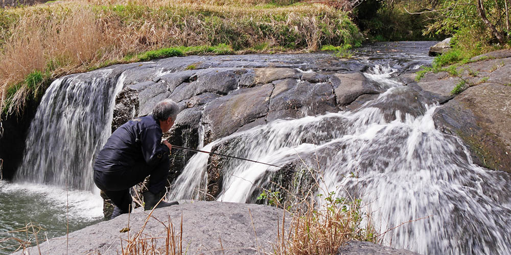 狙ったのは久住川にある笹川の滝壺ポイント。この場所は前支部長の漆間さん達と、がまかつの創業者である繁克社長に尺アマゴを釣って貰った所。