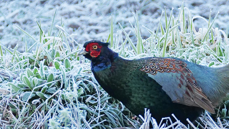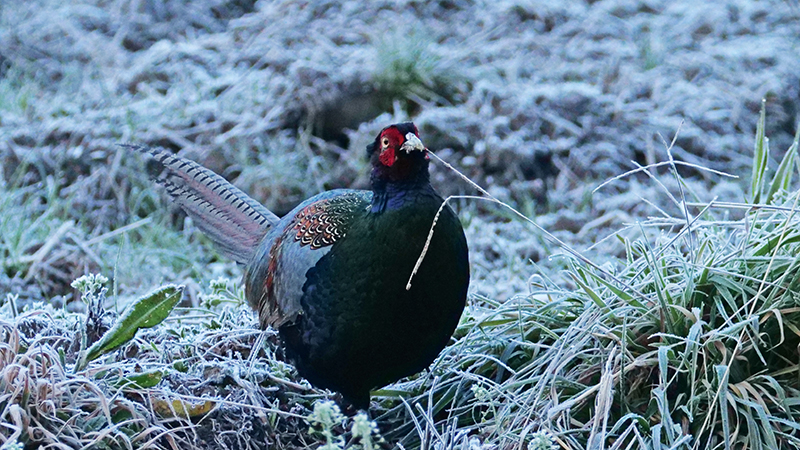 今朝のキジは、河原に面した田んぼ後の霜の降りた場所で採餌していた。