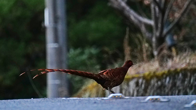 ヤマドリはその後の山道で2羽の♂に会ったけど、暗いから綺麗に撮れない。