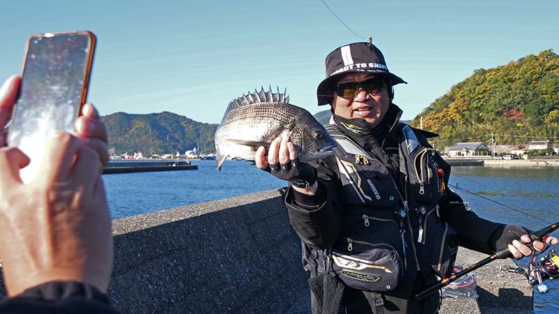 こんなアタリはヘダイが多いのですが、皆が見守る中タモに入ったのは52㎝、2.25㎏の大入島サイズのチヌでした。高切れが無ければ2枚1枚の予想は外れなかったけど・・。高松浦方面へ行った組は3枚のチヌが出たそうです。