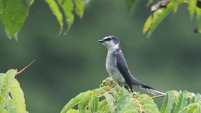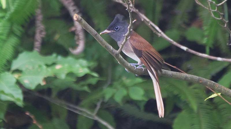 サンコウチョウの成鳥♂は、長い飾り羽・ブルーのアイリング・ブルーの嘴・緑の口中・脚指はグレーが特徴の夏鳥で、♀は長い飾り羽無し・ブルーのアイリングは薄く狭い・ブルーの嘴も薄い・口中の緑と脚指のグレーは♂とほぼ同じ。