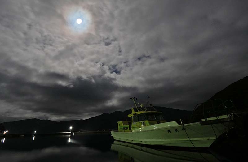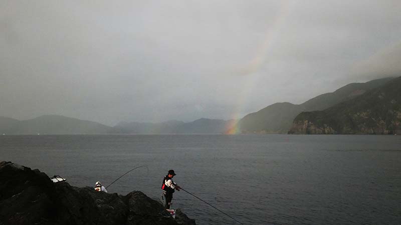 台風のウネリも大きくはならず、蒲江側と鶴見側は雨がかなり降った様でしたが、この場所は虹がかかる程度で道具も濡れません。皆のポイントを回りながら撮影したり会話したり・・福住会長との談笑は格別なものでした。
