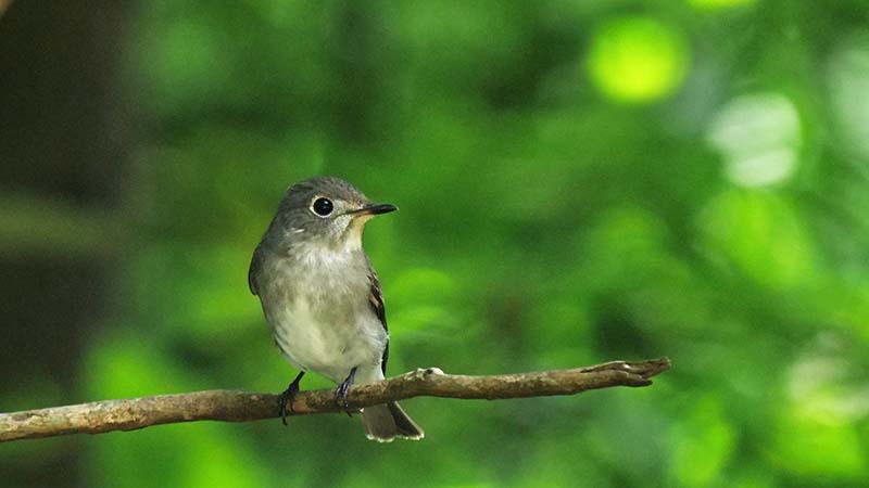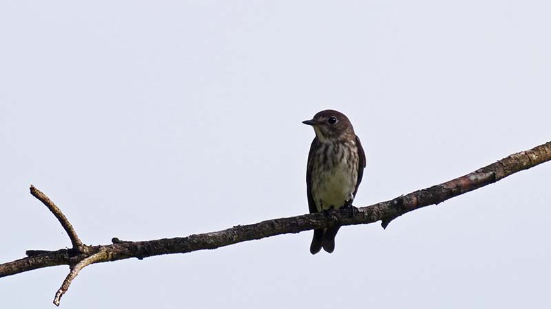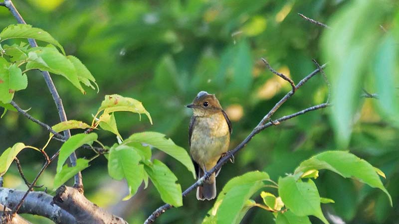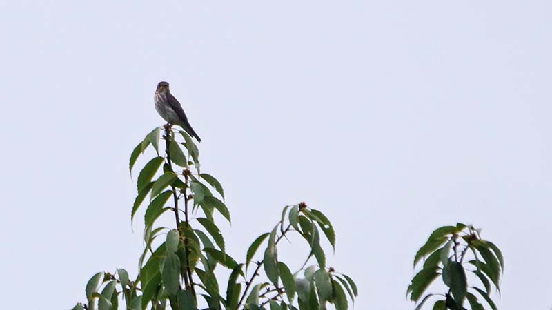 80mほど先の木の梢にらしき鳥、双眼鏡で覗くと正にエゾビタキ!